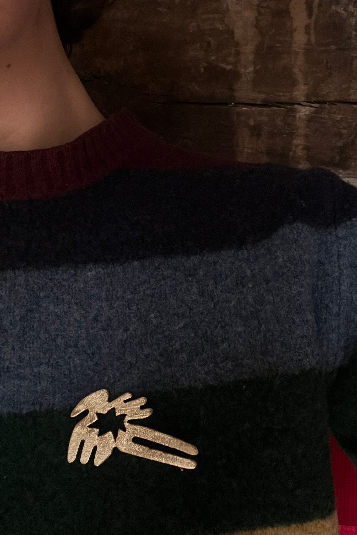 care: even varnished brass can slightly tarnish over time. Avoid contact with perfume or water, and be sure to store the brooch in its pouch